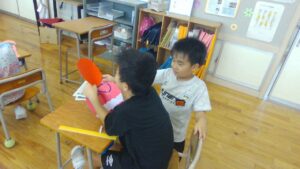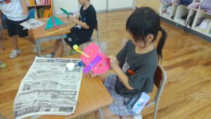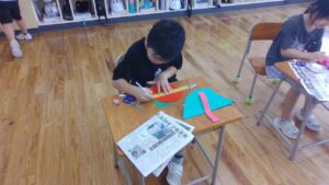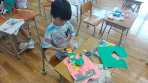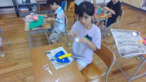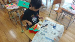 2年生の図画工作科の学習では、折った色工作用紙が開く仕組みから、動きに合う形や色を見付けて作品を作りました。紙が開く仕組みを作る際に、今まであまり使ったことがなかったホッチキスを使い、紙と紙をつなげました。何回かとめているうちに、どんどんとホッチキスを使うことが上手になりました。それぞれが動く作品の楽しさを味わいながら活動しました。
