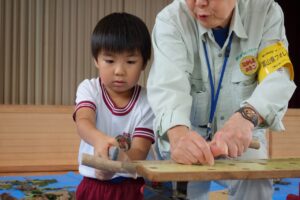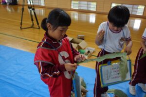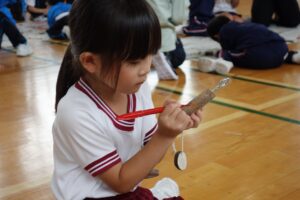 10月8日(水)に、上市中央小学校、白萩西部小学校と一緒にふるさと学習に行ってきました。1日体育館での活動となりましたが、秋にたくさん触れることができたとても充実した1日となりました。まず、フォレストリーダーさんと一緒に「秋見つけビンゴ」を使いながら、音のなるものやトゲトゲしたもの、匂いのするものなどを探しました。また、お土産としてバードコールを作りました。初めてのこぎりを使って木を切ったり、マジックで色を塗ったりしてそれぞれお気に入りのバードコールを作ることができました。次に金田さんの畑の作物の紹介をしていただきました。とても大きいかぼちゃを見たり、栗の実の収穫体験をしたりしました。午後からは3校の交流活動を行いました。玉入れとじゃんけん列車をして、協力したり楽しそうに話したりする姿がみられました。子供たちにとってとても楽しい1日になったようでした。