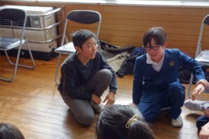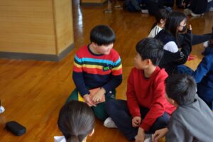 グループ協議では、他校のアイディアをもとに、統合後の学校生活をイメージしながら、取り入れたい学校行事を中心に話し合いました。陽南小学校では今年度、ミニ文化祭で餅つきをやったことや、運動会で地域の方々と、「みんなで一升」をやったことなどを話すと、他校の子供たちから「楽しそう!」「やってみたい!」という声が聞こえるグループもありました。