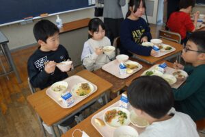 また、給食の時間も一緒に過ごしました。上市中央小学校の配膳の様子を見たり、楽しく話したりしながら給食をおいしくいただきました。
