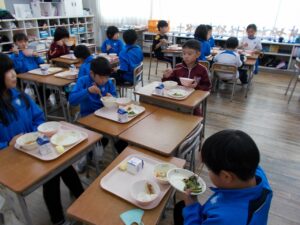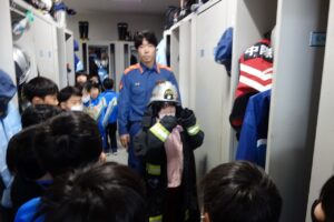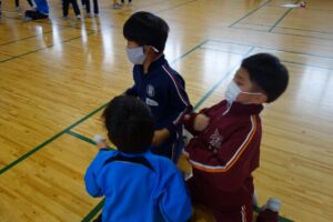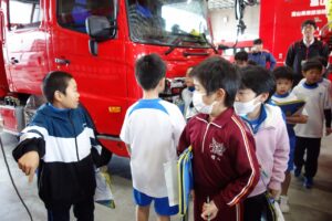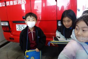 陽南小学校、白萩西部小学校、上市中央小学校の3年生が集まり3校合同学習が行われました。魚津市の東部消防本部を訪問し、消防自動車や通信指令室の見学をしました。実際に消防自動車のホースを持ち上げたり、防火衣を着用したりしながら、消防署の方の仕事について知ることができました。その後、上市中央小学校へ行き、見学で分かったことを発表し合ったり、いろいろなゲームを通して交流したりしました。子供たちは、それぞれのグループで他の学校の友達と楽しく活動していました。給食では、上市中央小学校の配膳のやり方で給食を取りに行き、放送を聞きながら給食を食べました。帰りには、「また、会おうね。」と声をかけ合って笑顔で手を振る姿が見られました。