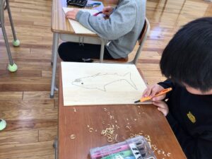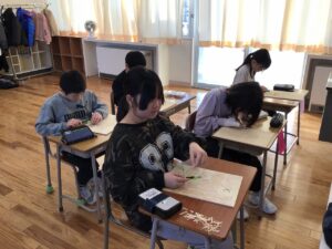 4年生は図画工作科の学習で木版画に取り組んでいます。昨年はゴム版画を経験しましたが、木版画には初めての挑戦です。木の板を彫る感触に戸惑いながらも、表したい線や形に合わせて彫刻刀を選び、丁寧に制作しています。けがをしないよう、正しい持ち方や姿勢を意識し、友達と声をかけ合いながら安全に取り組む姿が見られます。