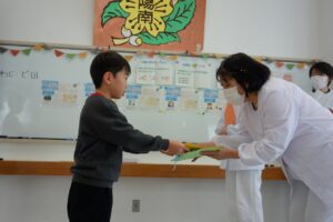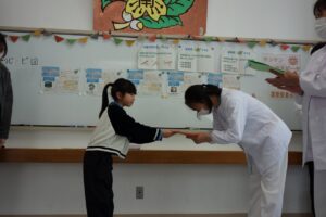 子供たちは、毎日おいしい給食を作ってくださっている調理員さんへ、「いつもありがとうございます」「給食が楽しみです」など、感謝の気持ちを込めた手紙を書き、代表児童が集会で手渡しました。