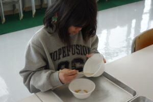 また、集会では「豆つまみ大会」も行いました。1分間でどれだけ豆を移動させられるかを競いました。子供たちは正しい箸の持ち方を意識しながら、集中して豆を移動させていました。
