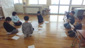 国語科の時間に漢字の音読みと訓読みを両方入れた文章を作り、「音訓かるた」にしてかるた取りをしました。子供たちは、習った漢字の中から音読みと訓読みの言葉を探し、よく考えて文章に表していました。読まれる文章をよく聞いて、どの漢字か見つけると、「あった」と嬉しそうにかるたを取っていました。