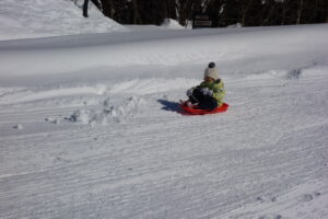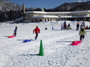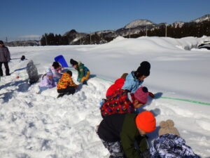 1・2年生は、白萩西部小学校の1・2年生と一緒に山野スポーツセンターへ雪上活動に行きました。まず、タワーづくり、そりリレー、宝探しをしました。タワーづくりとそりリレーでは同じ班の友達と仲良く協力したりお互いを応援したりする姿がみられました。宝探しでも、早く宝を見付けられた子がまだ見付けられていない友達の宝を一緒に探していて、とても素敵な姿がたくさんみられました。自由時間には、長い斜面でそりを楽しんだり、かまくらを作ったりして、思いっきり雪で遊びました。新しい友達ができたり、いつもよりたくさんの雪で遊んだりできて、とても楽しい1日になりました。